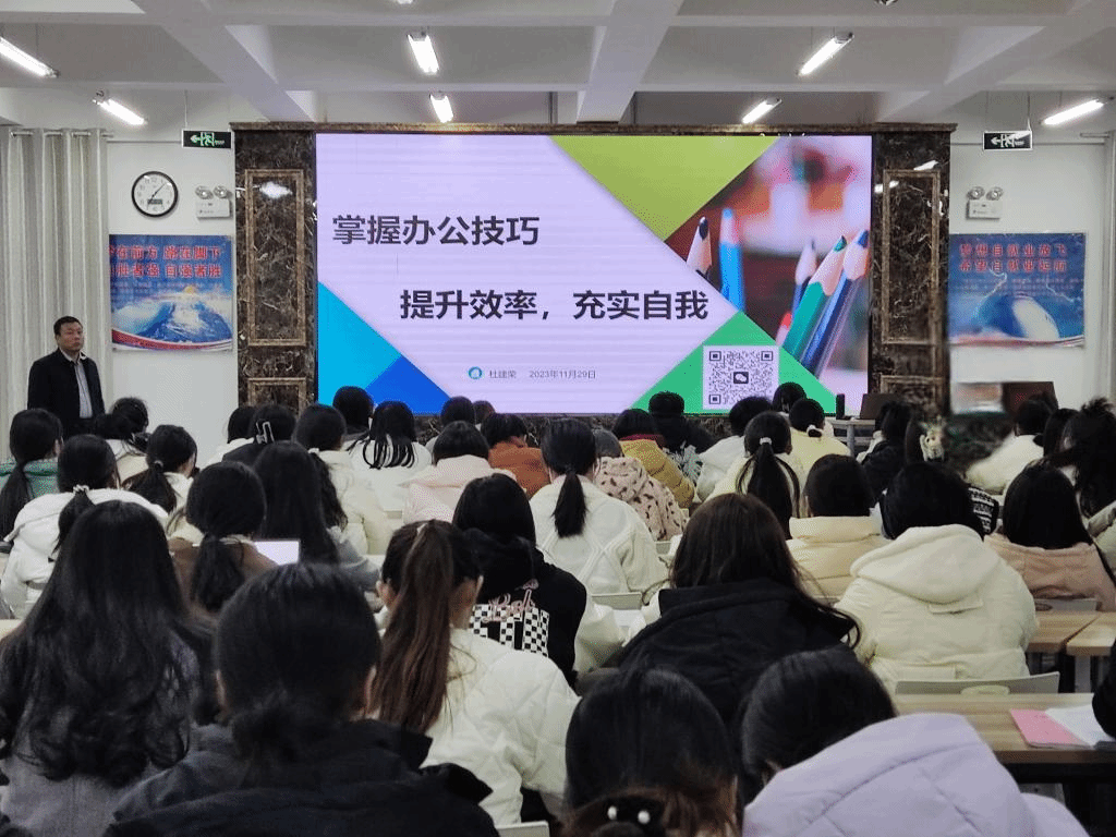 杜建荣老师以《掌握办公技巧 提升效率 充实自我》为题,通过现场操作演练方式,详细讲述了word、Excel和Powerpoint等常用办公软件的操作方法和技巧。同学们用随身携带的手提电脑进行现场练习,达到了预期培训效果。