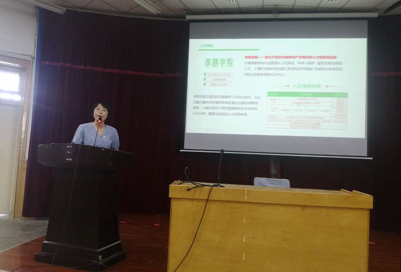 宋佳女经理以“养老护理专业现状及行业发展前景”为题,从积极应对人口老龄化的社会需求、养老服务人才培养体系、养老服务人才队伍建设、康养旅居产业发展、社区居家养老服务实践、区域性养老服务一体化创新融合发展等方面作了报告。 同时,与师生分享了自身从复旦大学毕业后,投身华邦美好家园养老集团创业的励志故事,介绍了养老服务产业对养老服务管理和护理人才的旺盛需求,热情鼓励养老服务管理专业和护理专业毕业生,胸怀孝慈情怀,投身养老事业,成就美好人生。